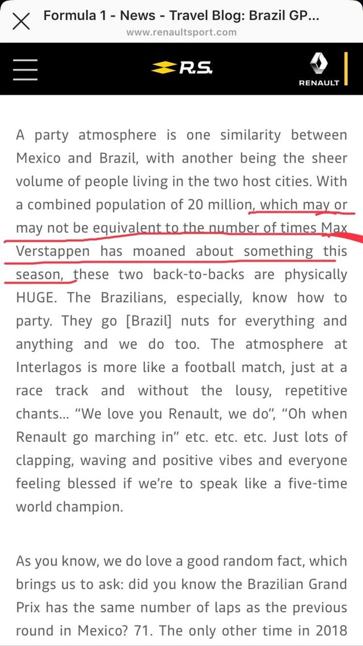 «Общее число жителей Мехико и Сан-Паулу насчитывает 20 миллионов, что может совпадать, а может и не совпадать с числом жалоб Макса Ферстаппена в течение сезона, но оба этих места просто ОГРОМНЫ».