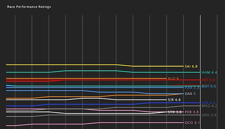 Вторым в чарте стал победитель гонки Льюис Хэмилотон из «Мерседеса» — его оценка в 6,4 сложилась из 9,2 за работу с педалью газа, 9,5 за работу рулем, 5,8 за работу на торможениях, 1,5 за прохождение поворотов и 6,0 за «агрессивность».