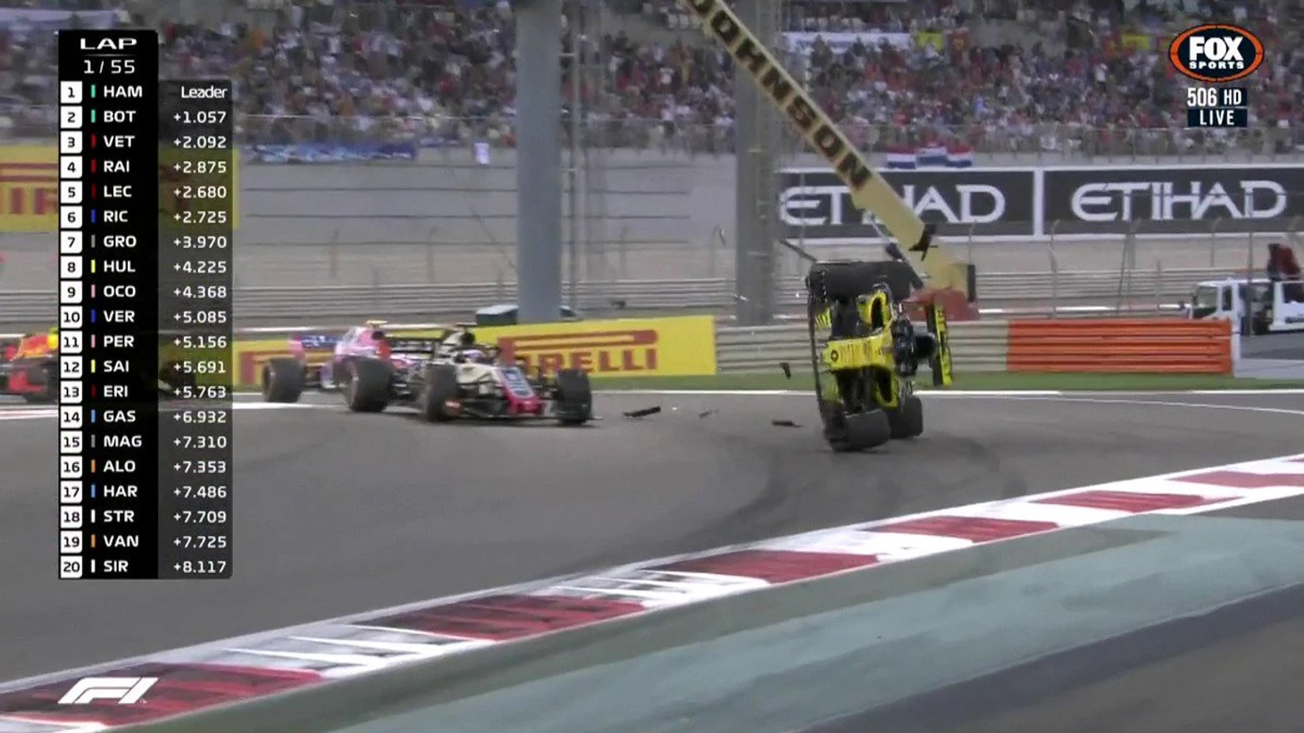 Старт Гран-при Абу-Даби вышел довольно спокойным, пока полкруга спустя пилот «Рено» Нико Хюлькенберг не попробовал опередить гонщика «Хааса» Ромена Грожана. Француз ошибся в обороне, слишком глубоко уехал в поворот и оказался в слепой зоне немца — потому прохождение следующего поворота закончилось вот этим.