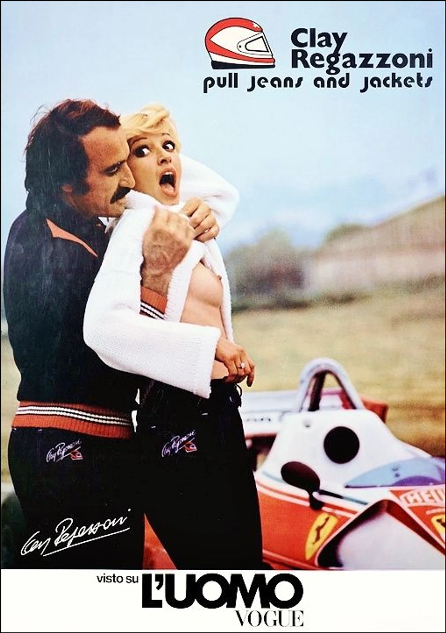 В 1976 году «Феррари» совместно с Клэйем Регаццони выпускала специальную линейку одежды для водителей. И рекламировали ее вот такими вот постерами.