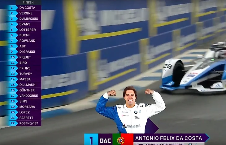 Новичкам часто бывает непросто разобраться, кто есть кто, и сходу влиться в происходящее. А у «Формулы Е» как у довольно молодой серии нет схожего апломба: там осознают необходимость в чуть более понятной идентификации пилотов, и потому графика почти все время показывает полные фамилии участников — часто еще и с логотипами команд.