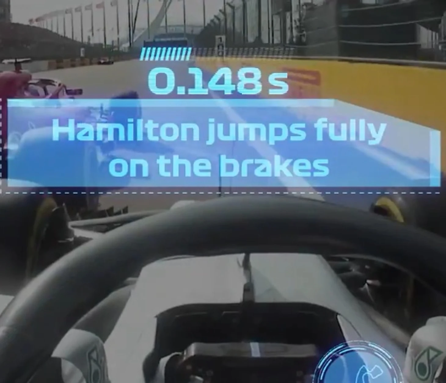 После того, как Хэмилтон осознал, что пространства больше не осталось, до полного нажатия на педаль тормоза прошло менее 0,15 секунды. Еще спустя 0,12 секунды он отпустил педаль газа. После 0,48 секунды с момента перекрытия траектории пятикратный чемпион мира уже ушел от столкновения и вырулил влево.