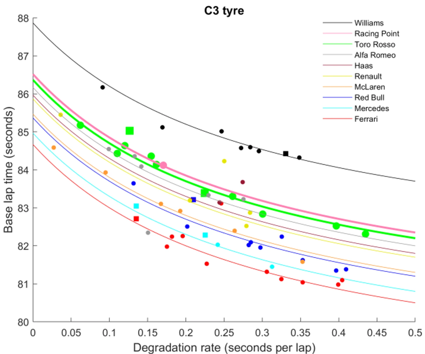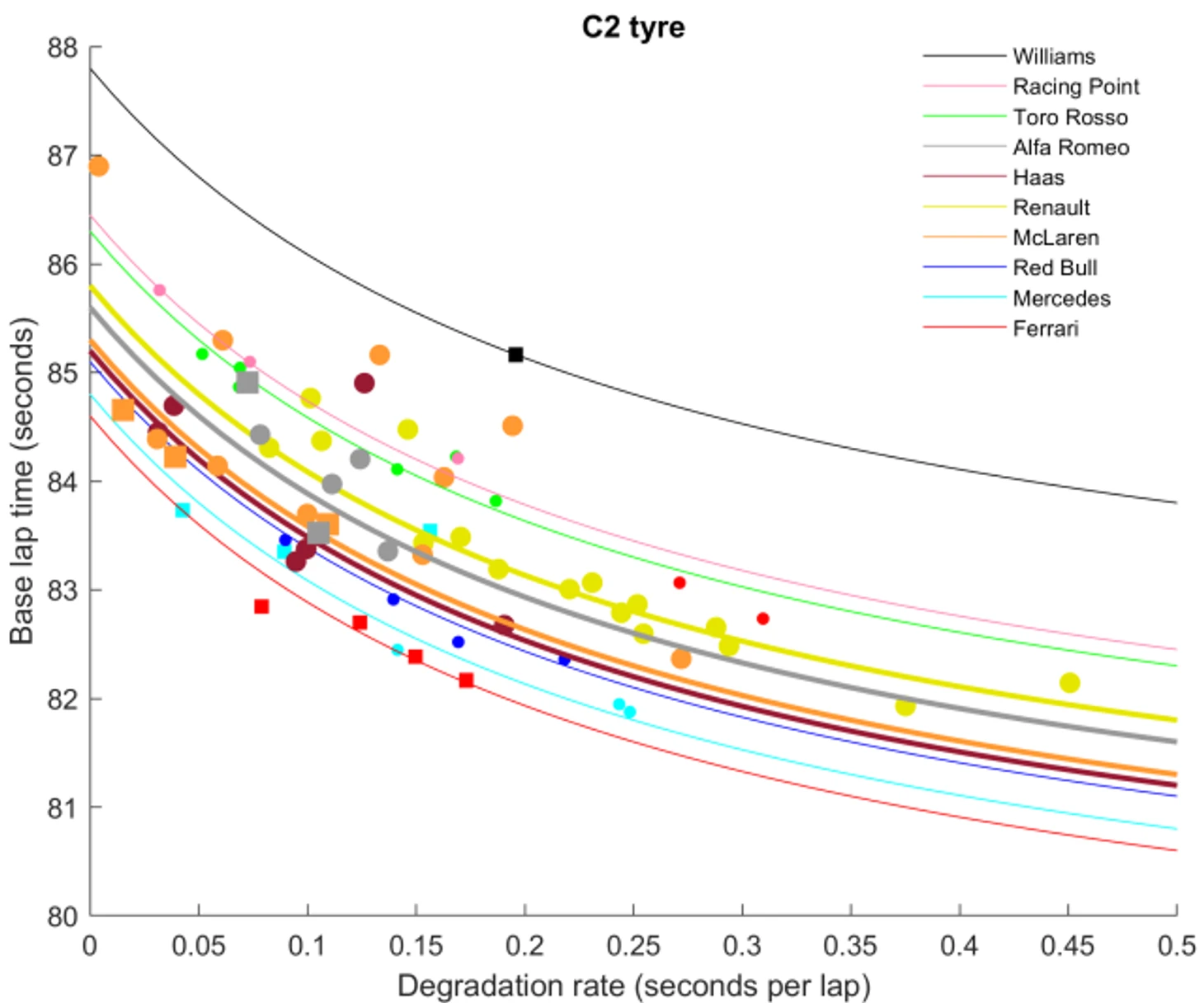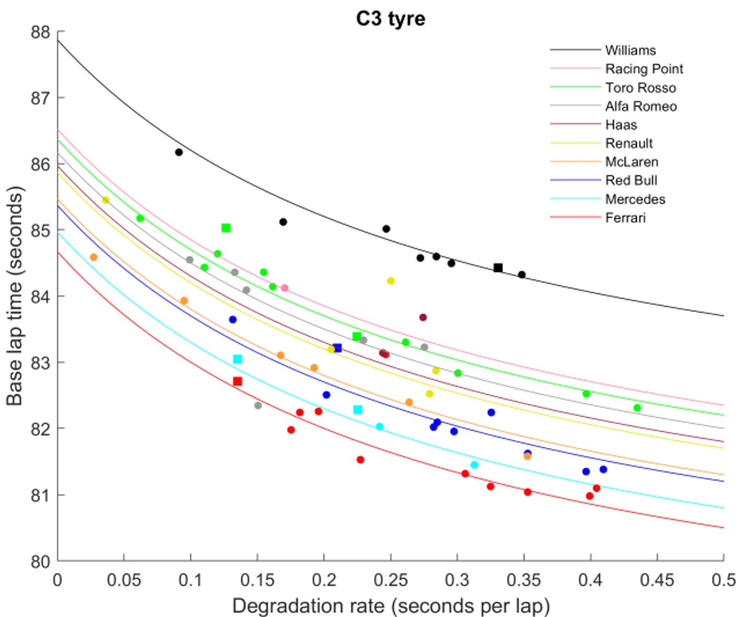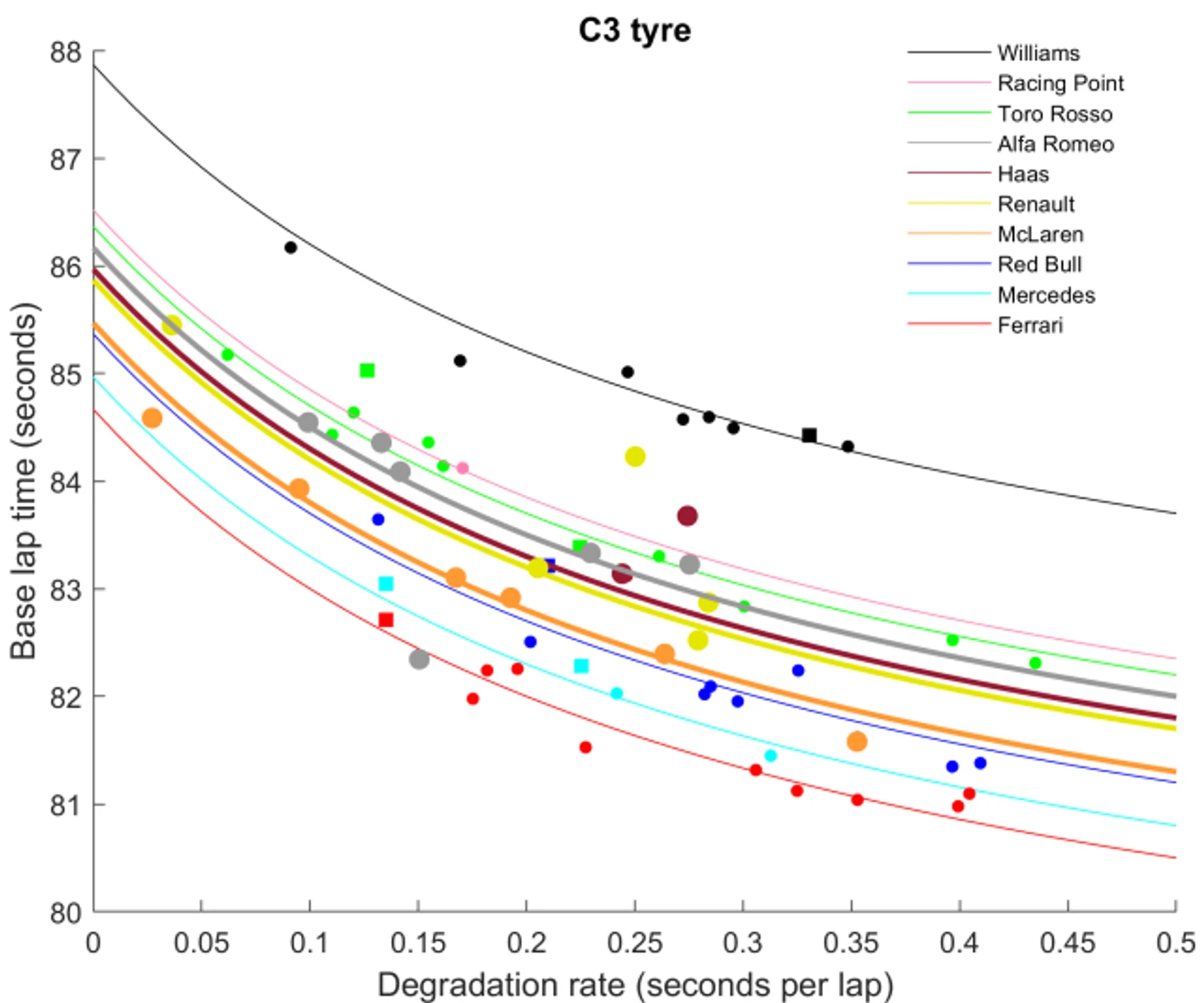 По вертикальной оси Филлипс расположил ожидаемое время круга в соответствии с уровнем сцепления шин, а по горизонтальной расположилась ожидаемая деградация покрышек, выраженная в потерянных на круге секундах. Темп изначально скорректирован для гоночной топливной загрузки (для 70-кругового Гран-при). Маленькие точки — среднее время с реального длинного отрезка на определенном типе шин с неизвестной топливной загрузкой. Квадраты обозначают времена, показанные в процессе реальной симуляции гонки на тестах.
