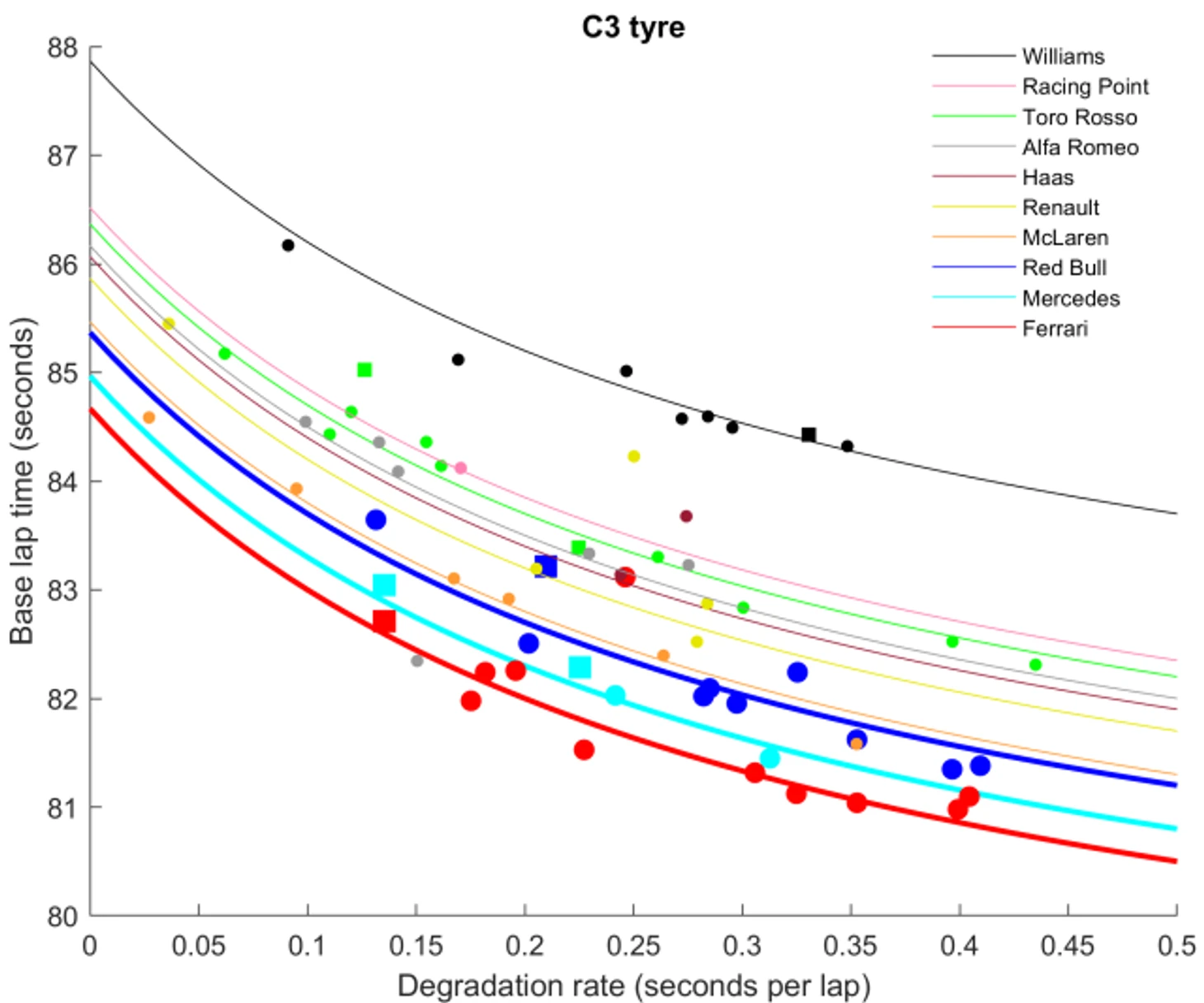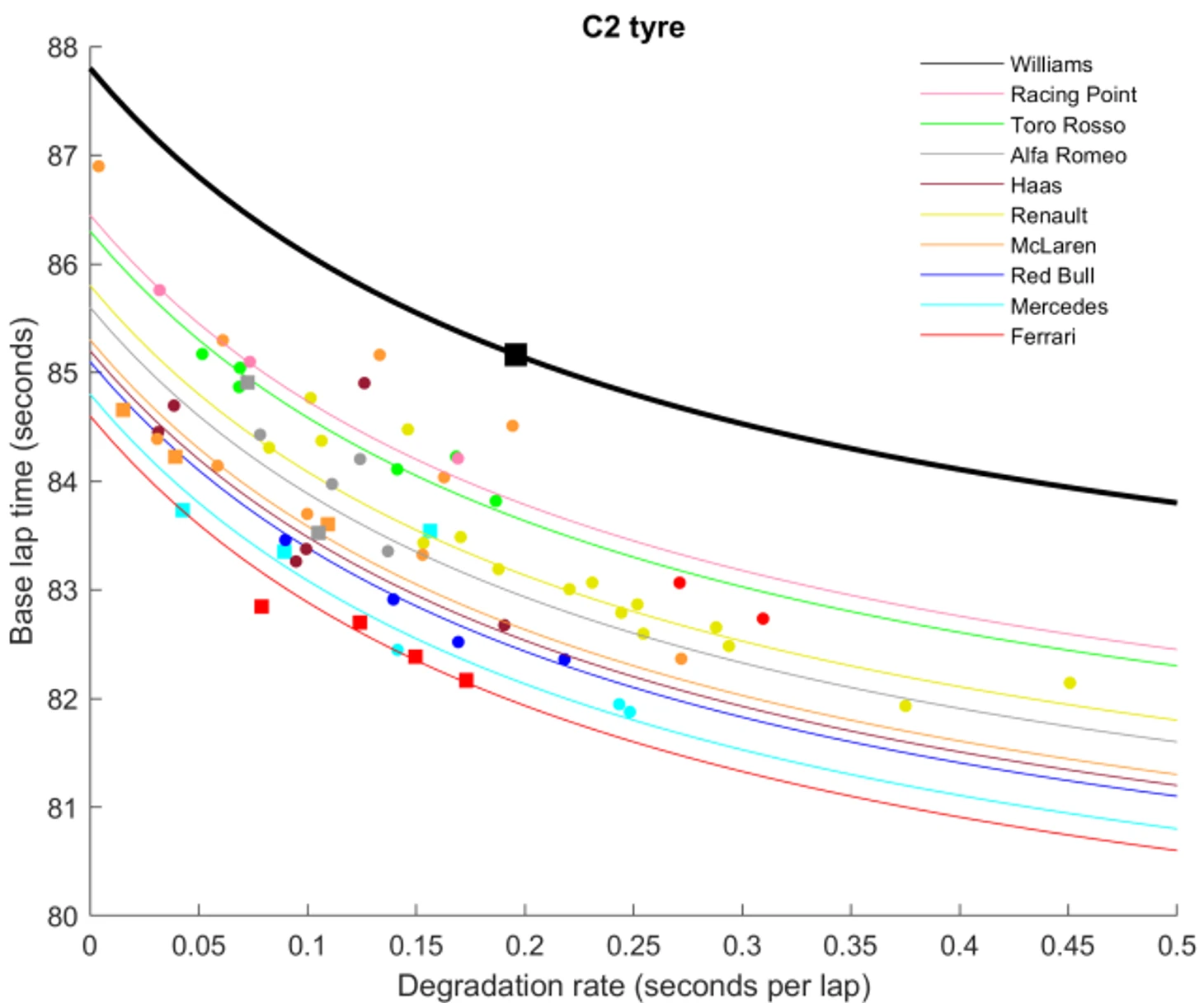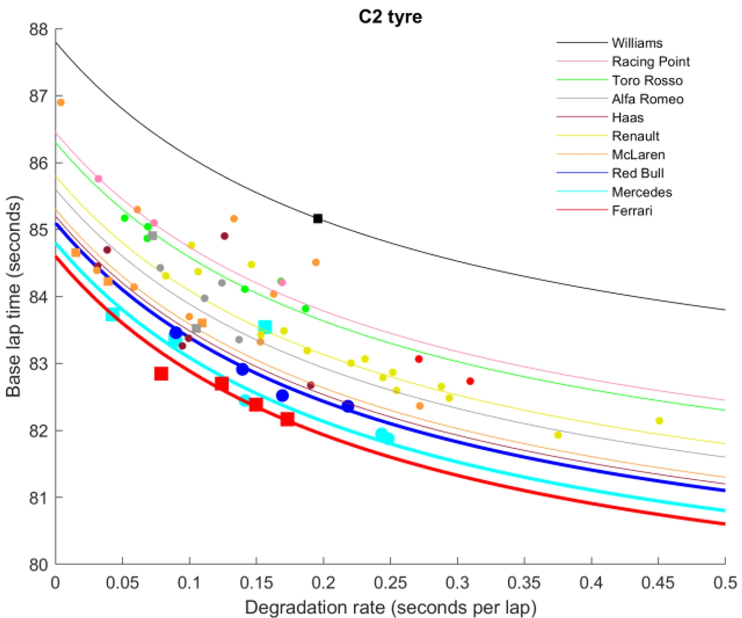 По вертикальной оси Филлипс расположил ожидаемое время круга в соответствии с уровнем сцепления шин, а по горизонтальной расположилась ожидаемая деградация покрышек, выраженная в потерянных на круге секундах. Темп изначально скорректирован для гоночной топливной загрузки (для 70-кругового Гран-при). Маленькие точки — среднее время с реального длинного отрезка на определенном типе шин с неизвестной топливной загрузкой. Квадраты обозначают времена, показанные в процессе реальной симуляции гонки на тестах.