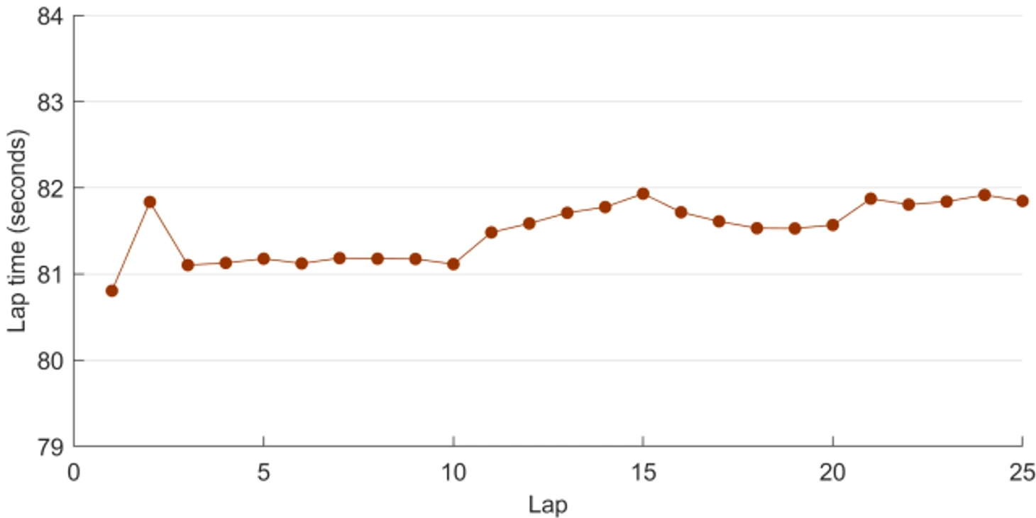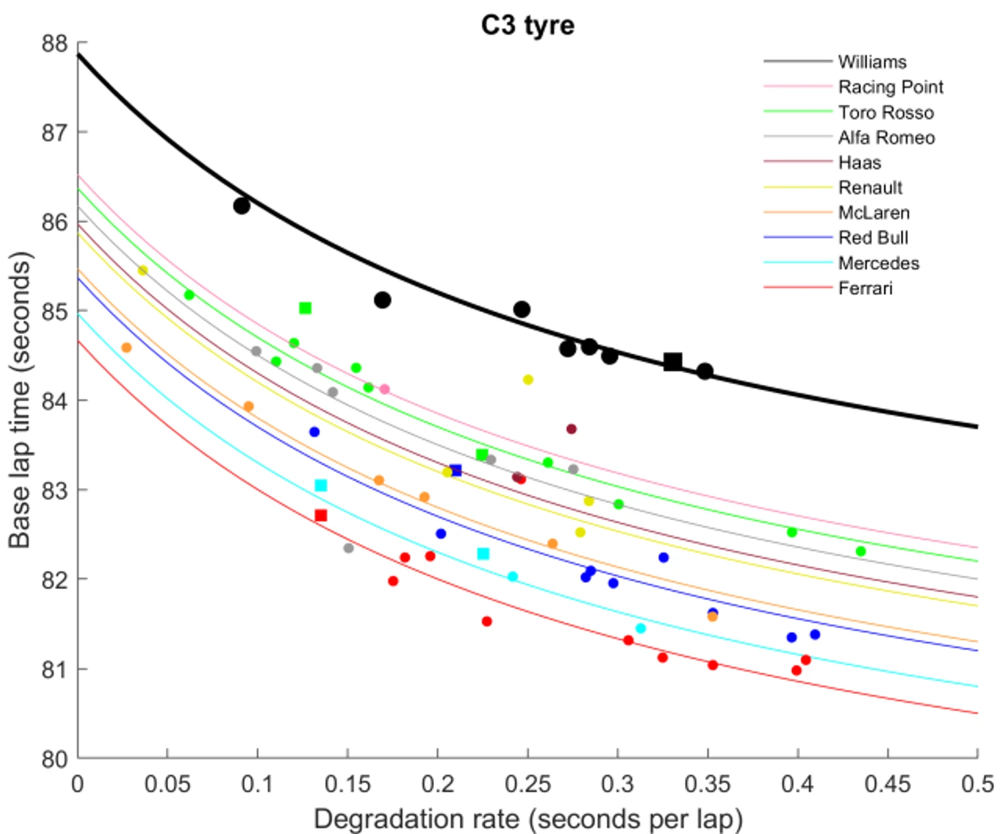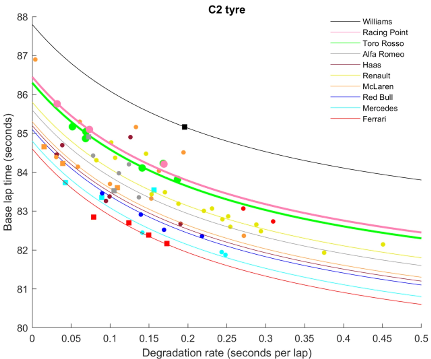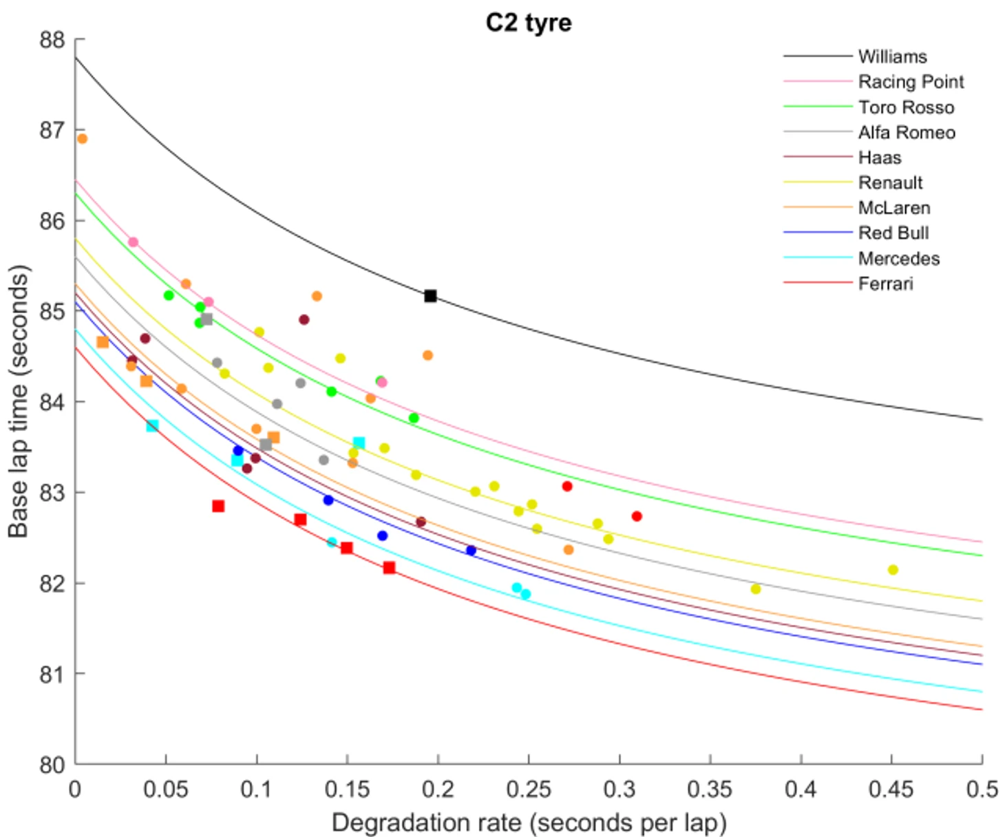 По вертикальной оси Филлипс расположил ожидаемое время круга в соответствии с уровнем сцепления шин, а по горизонтальной расположилась ожидаемая деградация покрышек, выраженная в потерянных на круге секундах. Темп изначально скорректирован для гоночной топливной загрузки (для 70-кругового Гран-при). Маленькие точки — среднее время с реального длинного отрезка на определенном типе шин с неизвестной топливной загрузкой. Квадраты обозначают времена, показанные в процессе реальной симуляции гонки на тестах.