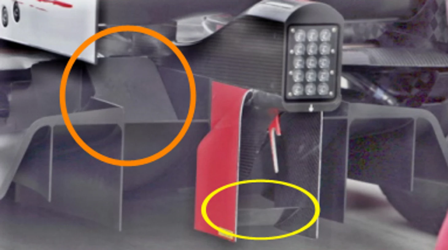 Сразу видно, что изогнутая центральная часть диффузора «Браун» не похожа ни на одну из других. Именно эту область опротестовали команды. Четко, как у «Уильямс», тут нельзя сказать, что в верхнем левом и верхнем правом краях центральной части диффузора имеются небольшие отверстия, которые подают воздух из верхней части болида в диффузор для ускорения воздуха.