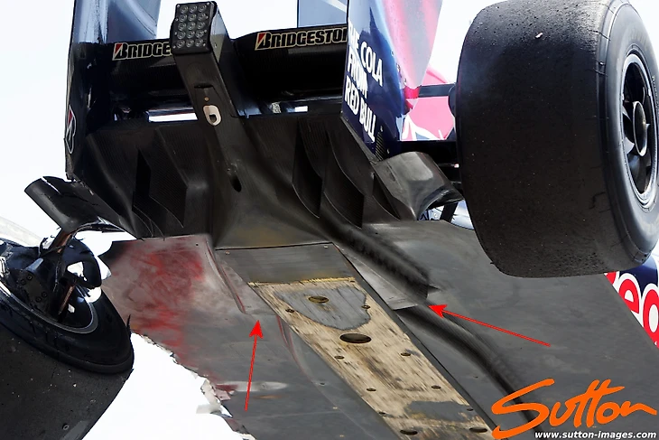 Это диффузор «Ред Булл, который не опротестовали. Если вы посмотрите на концевые пластины заднего крыла, вы увидите, что они проходят вниз рядом с диффузором и по всей его высоте. Концевые пластины эффективно расширяют ширину и глубину диффузора. Это не так противоречиво, как рассмотренные выше диффузоры.
