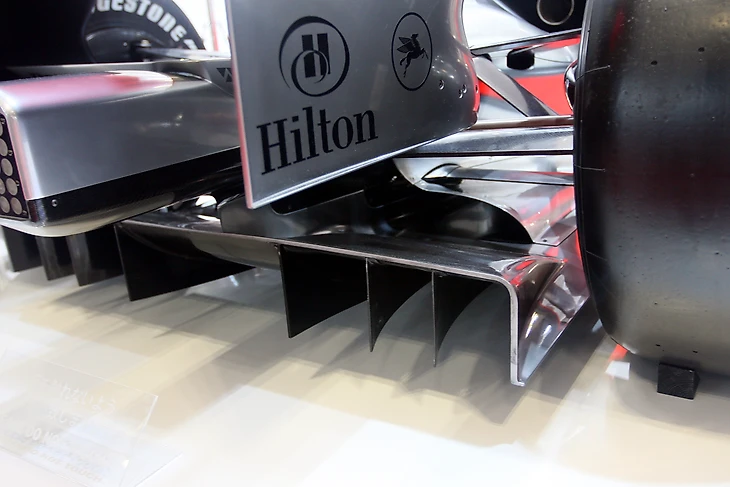 На фото показан диффузор на болиде «Макларен». Правила 2009 года гласят, что детали кузова, видимые снизу машины и находящиеся между осью задних колёс и отстоящей от неё на 350 мм линией, не могут быть выше 175 мм над плоскостью трассы. Всё, что выше плоскости 200 мм (заднее антикрыло), должно быть не шире 750 мм, а всё, что ниже (диффузор), — не шире 1000 мм. Зона в пределах 200-400 мм предназначена для размещения элементов безопасности, в частности заднего фонаря, но опять же никто не запрещал её аэродинамического применения. Вот вам и лазейки в правилах. Посчитать я думаю не сложно размеры дыр в регламенте.