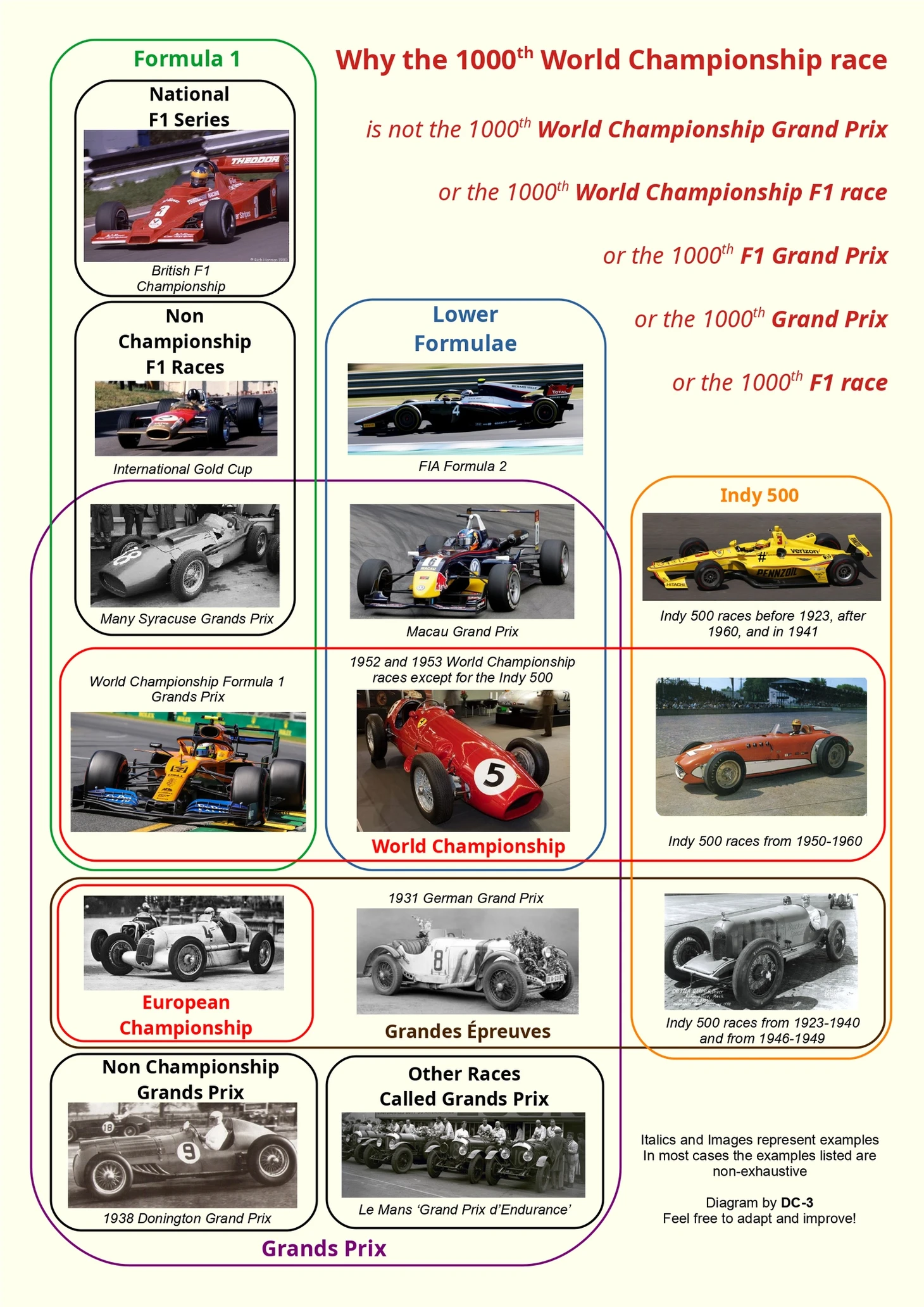 Пользователь соцсети Reddit изобразил на картинке, какие гонки относятся к чемпионату мира, Формуле-1, Гран-при и так далее. Красной линией по середине обведено то, благодаря чему 14 апреля 2019 года в Китае отмечается тысячная гонка чемпионата мира.