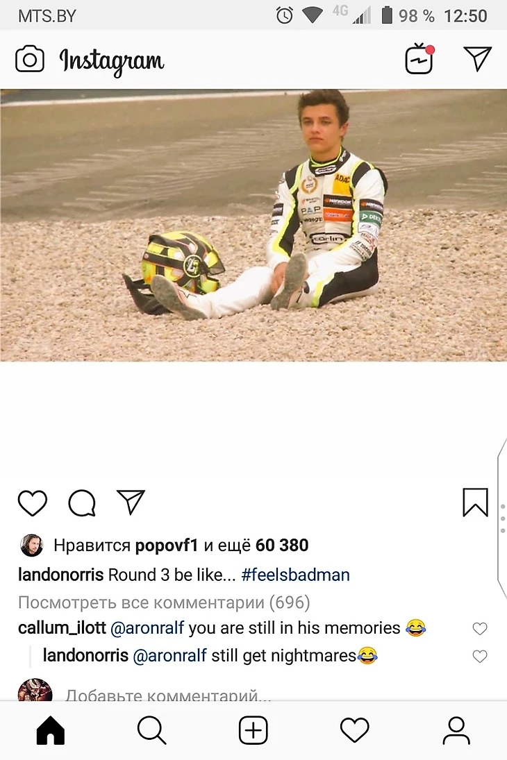 «До сих пор снятся кошмары! [о том инциденте]», – ответил Ландо на комментарий Ральфа Арона, как раз и выбившего тогда Норриса в одной из гонок «Формулы-3».