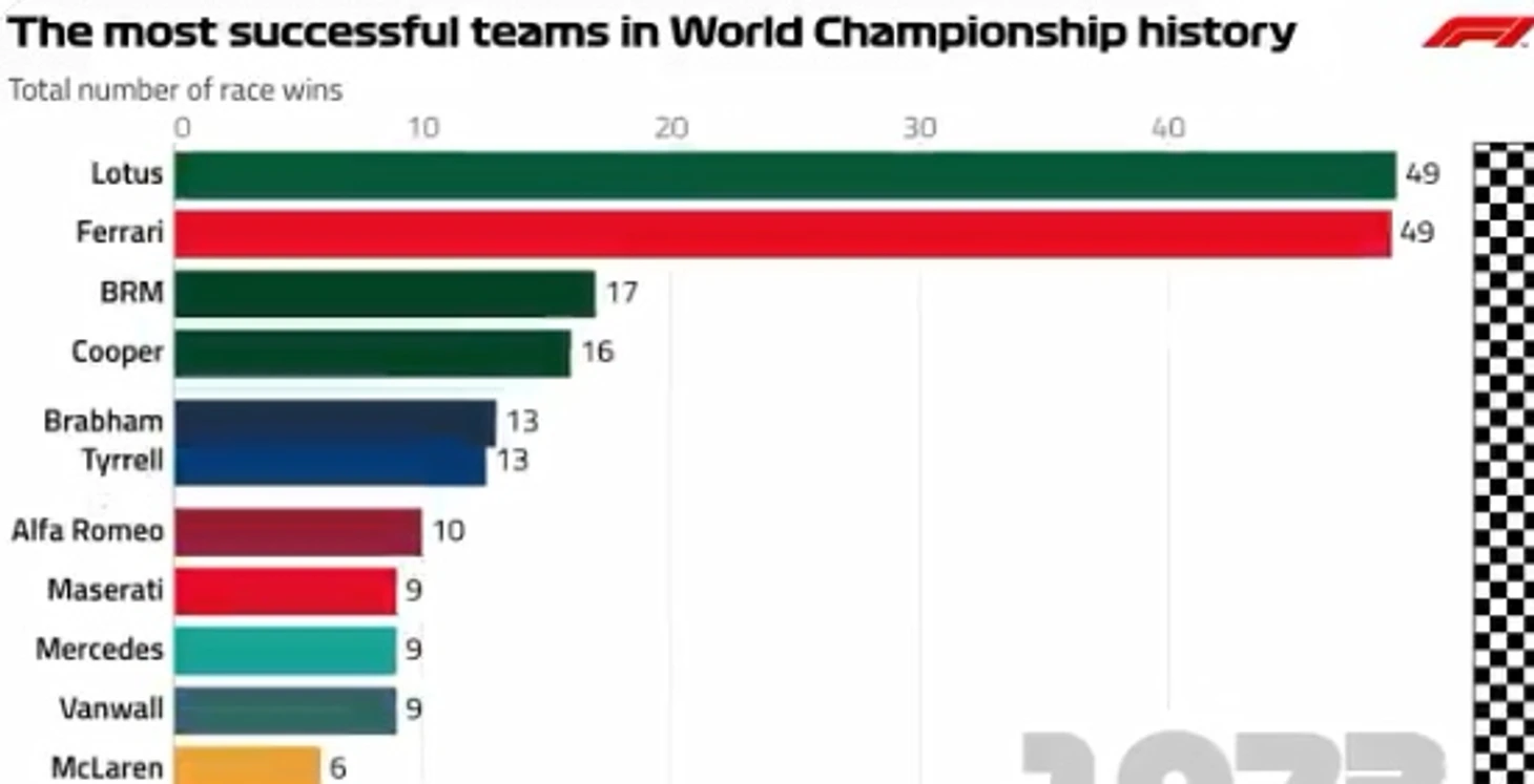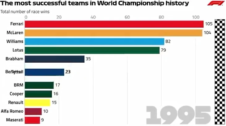 «Формула-1» опубликовала официальную инфографику динамики количества побед у каждой из команд с самого первого сезона.