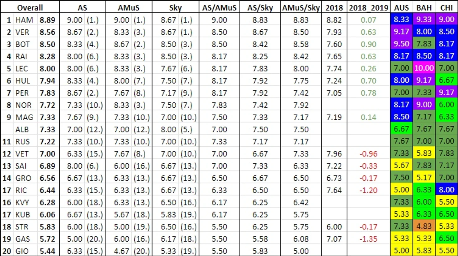 Первая графа — средняя оценка трех изданий, вторая — баллы от Autosport, третья — от Auto Motor und Sport, четвертая — от Sky Sports. Следующие три рассчитывают средний балл по двум изданиям для исключения сильного влияния предвзятости.