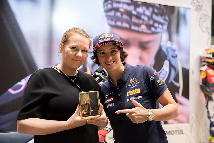 Экшн был не только на улице. На стенде Motul атлет бренда Анастасия Нифонтова вручила слиток золота победителю международной промоакции, посвященной легендарному ралли-марафону «Дакар». Среди 3000 участников, купивших моторное масло линейки 8100 для своего автомобиля и зарегистрировавших код на сайте, Надежда из Сосновоборска стала счастливым обладателем драгоценного приза!