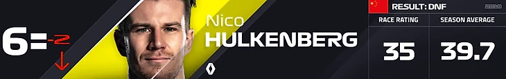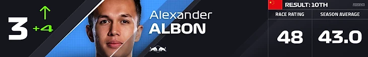 Судя по видимым оценкам, эксперты «Формулы-1» признали лучшим гонщиком Гран-при Китая напарника Даниила Квята Александра Албона. Вторым стал Льюис Хэмилтон, а третьим — Макс Ферстаппен и Серхио Перес.