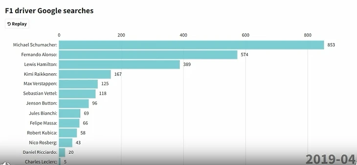 На реддите опубликовали краткую выжимку об уровне популярности поисковых запросов в Google о гонщках «Формулы-1» – с того самого момента, как интернет-гигант вообще начал собирать и обрабатывать такую информацию в 2004-м.
