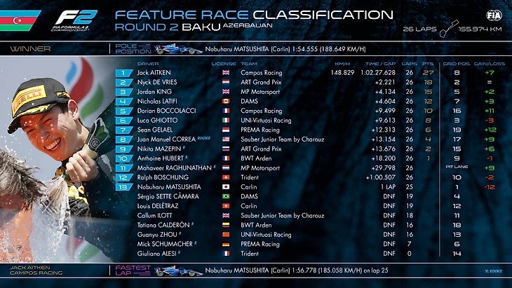 15:35 Вообще безумие в Баку уже полноценно началось в «Формуле-2». Вчера маршалы, эвакуировавшие машину Шона Гелаэля, умудрились попасть ему под колеса. А в сегодняшней гонке там сошла половина пелотона, причем Сержиу Сетте Камара умудрился разбить автомобиль в режиме сейфти-кара: грел шины и вмазался в стену. Привет Ромену Грожану! Никита Мазепин доехал до топ-10, Мик Шумахер сошел, а выиграл Джек Эйткен. Вот результаты гонки: