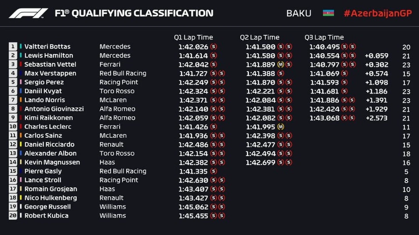 – «Мерседес» безупречен. Очередная спокойная и безошибочная сессия, очередной первый ряд. У кого-нибудь есть вопросы, почему эта команда доминирует уже шестой год? А Боттас снова удивил поулом и заодно побил рекорд трассы в Баку.