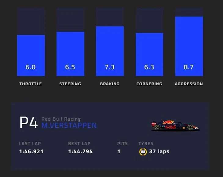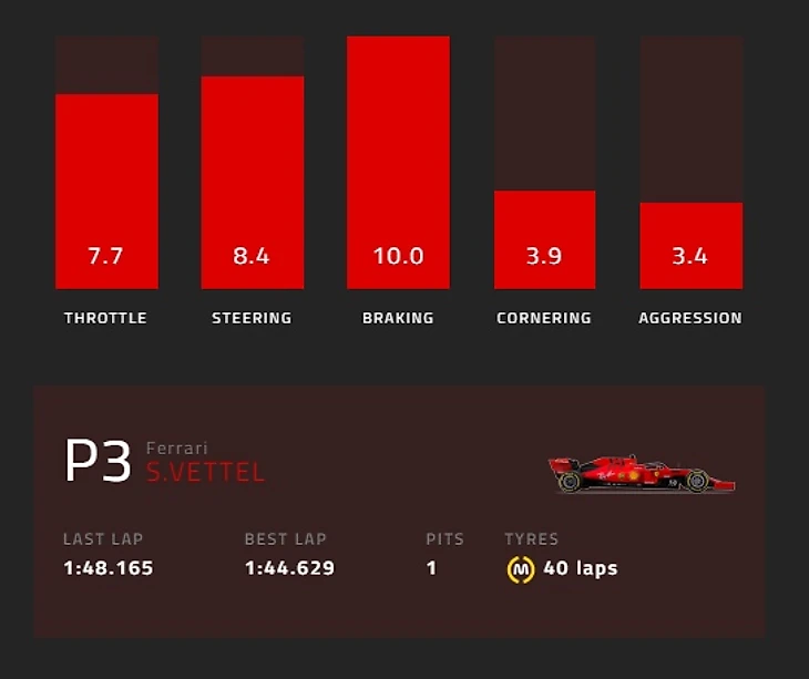 Оценка Феттеля получилась из 7,7 за работу с педалью газа, 8,4 за работу рулем, 10 за работу на торможениях, 3,9 за прохождение поворотов и 3,4 за «агрессивность». Себ в итоге приехал на финиш третьим.