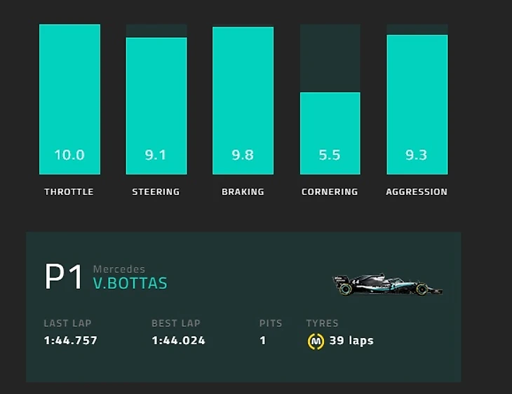 В соответствии с ними лучше всех пилотировал от старта до финиша финский пилот «Мерседеса» Валттери Боттас — его оценка в 8,7 сложилась из 10 за работу с педалью газа (максимальный балл), 9,1 за работу рулем, 9,8 за работу на торможениях, 5,5 за прохождение поворотов и 9,3 за «агрессивность». Бывший второй пилот «серебряных стрел» реализовал поул, выиграл заезд и вернул себе лидерство в общем зачете. На прошлом Гран-при Китая Боттас накатал на второе место по данным телеметрии.