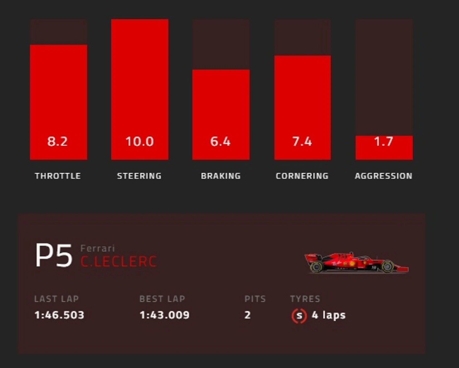Леклер получил тот же балл за 8,2 за работу с педалью газа, 10 за работу рулем, 6,4 за работу на торможениях, 7,4 за прохождение поворотов и 1,7 за «агрессивность». Шарль оказался на финише лишь пятым и установил лучший круг.