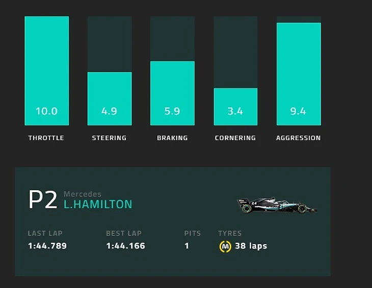 Оценка Хэмилтона сложилась из 10 за работу с педалью газа, 4,9 за работу рулем, 5,9 за работу на торможениях, 3,4 за прохождение поворотов и 9,4 за «агрессивность». Льюис в итоге приехал на финиш вторым.