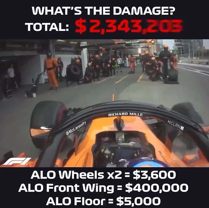 Кстати, Алонсо в столкновении с Хюлькенбергом и Сироткиным получил повреждений на 408 тысяч долларов — 400к ушло на новое антикрыло, 5 тысяч ушло на восстановление элементов днища, а 3600 долларов пришлось потратить на новые колеса.
