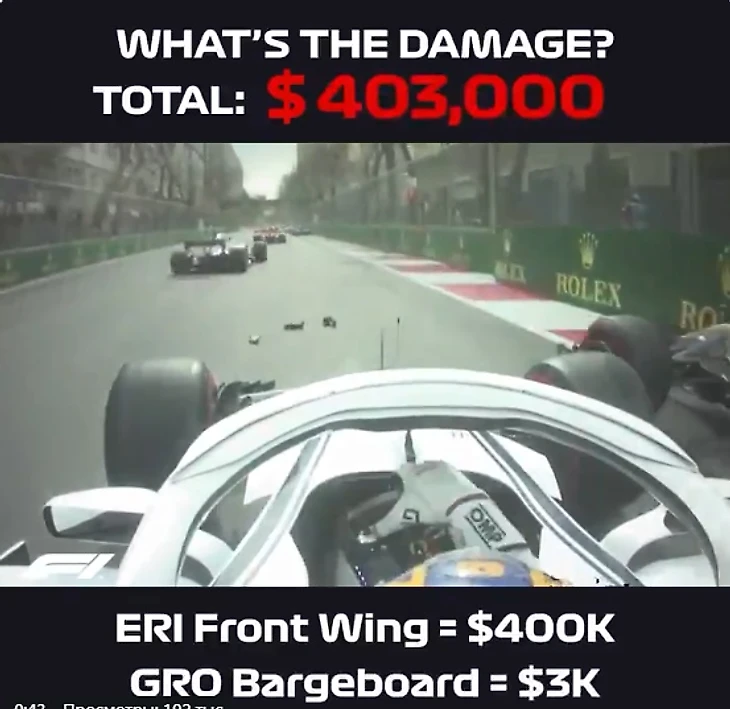 Первое столкновение Маркуса Эрикссона из «Заубера» и Ромена Грожана из «Хааса» оценили в 403 тысячи долларов (400к за переднее антикрыло Маркуса, а в 3к обошлись новые боковые дефлекторы Ромена).