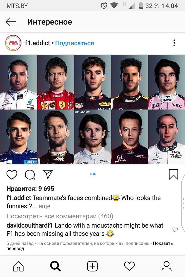 Инстаграм-аккаунт F1 Addicts устроил сеанс обмена лицами между напарниками команд «Формулы-1». Получились два десятка настоящих красавцев!