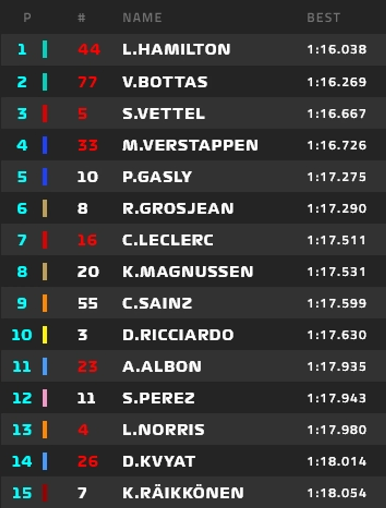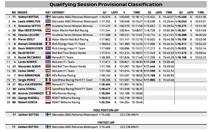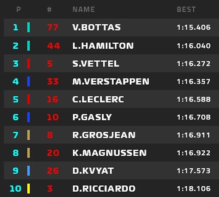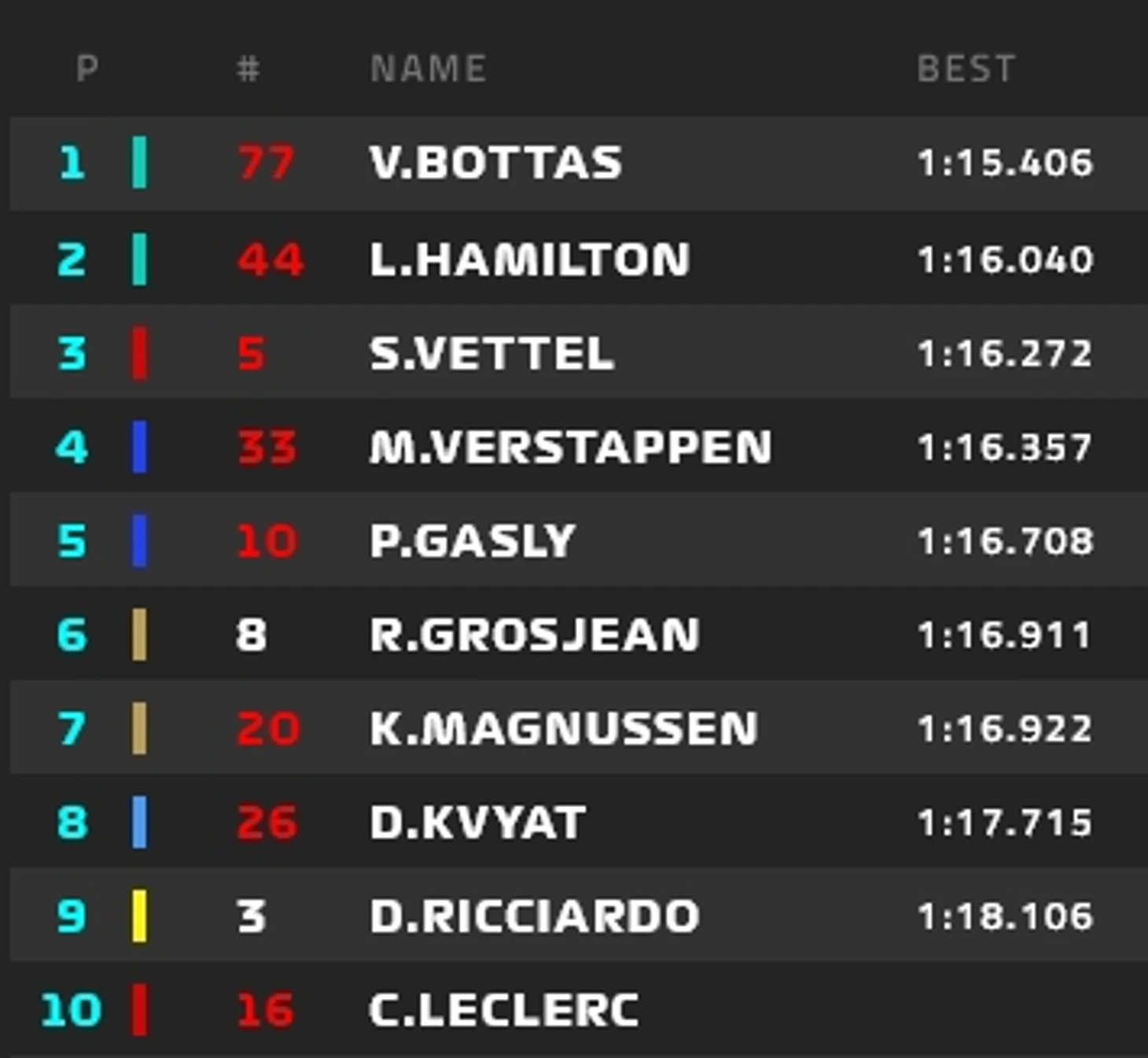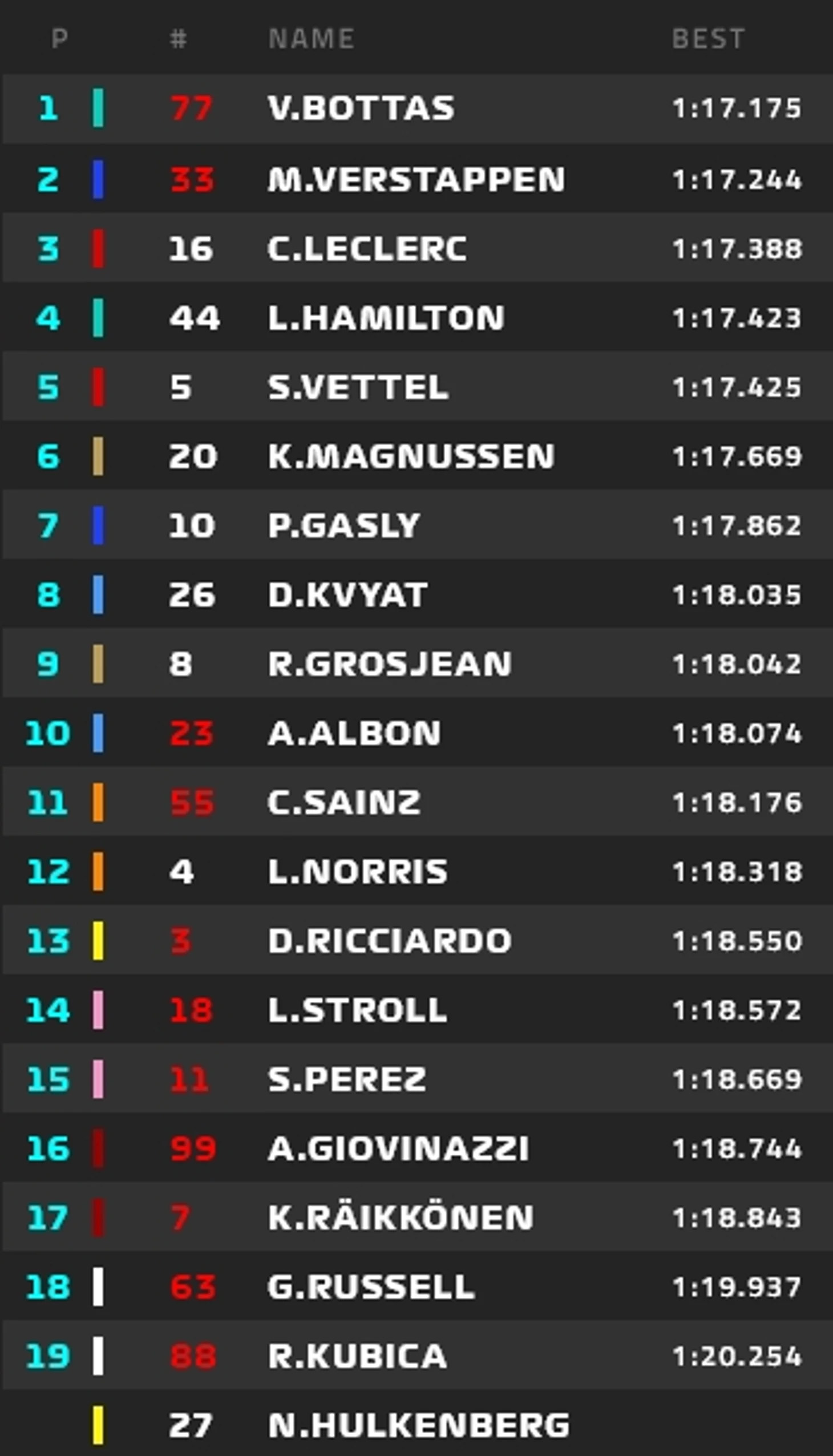 Боттас, Хэмилтон, Феттель, Леклер, Ферстаппен, Гасли, Грожан, Квят, Магнуссен и Риккардо.
