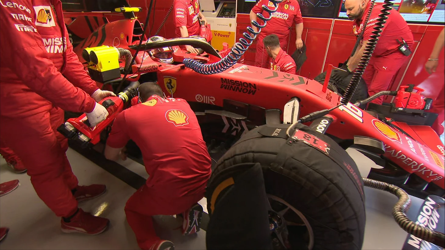 Леклер из боксов не выезжал – механики возятся с его машиной.