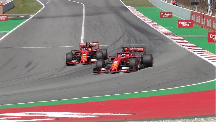 9-й круг Леклер показывает себя в зеркалах Феттеля, недвусмысленно намекая, что может ехать быстрее. Вопрос, как поступят на командном мостике «Феррари»...