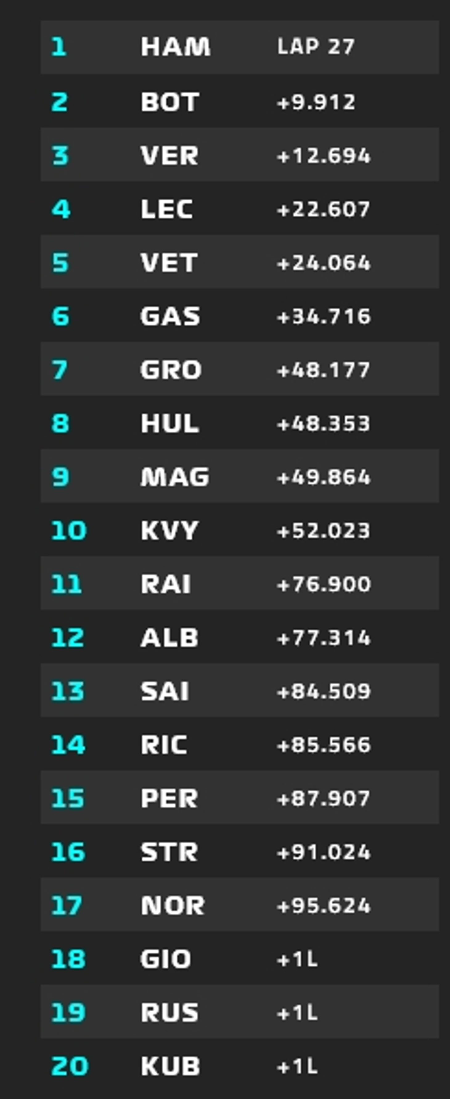 29-й круг Лучший круг гонки у Боттаса, который немного сократил отставание от Хэмилтона. Тем не менее, преимущество Льюиса пока слишком велико.