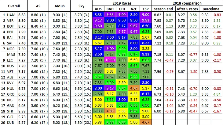 Первая графа — средняя оценка трех изданий за сезон, вторая — баллы от Autosport за сезон, третья — от Auto Motor und Sport за сезон, четвертая — от Sky Sports за сезон. Графа ESP – среднее арифметическое от изданий по результатам Гран-при Испании