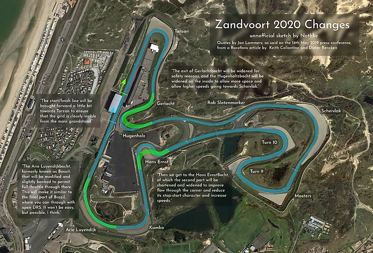 «Мы сместим черту старта-финиша чуть ближе к первому повороту «Тарзан», чтобы старт полностью просматривался с главной трибуны, – рассказал директор Гран-при Ян Ламмерс. – Третий и четвертый повороты расширим на внешней траектории ради безопасности и лучшего разгона перед виражом «Схейвлак». Заключительный поворот изменим так, чтобы гонщики могли проезжать его с полным газом, как на «Интерлагосе». Поворот «Ханс Эрнстбохт» сократят и чуть расширят, чтобы увеличить скорость».