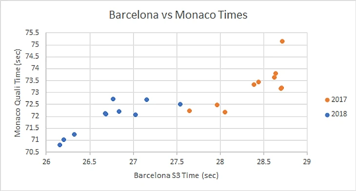 Пользователь реддита, ведущий блог об аналитике в «Формуле-1», рассчитал зависимости времени на круге в Монако по отношению времен на последнем секторе трассы в Барселоне за 2017 и 2018 года. В результате обнаружилась 71-процентная зависимость.