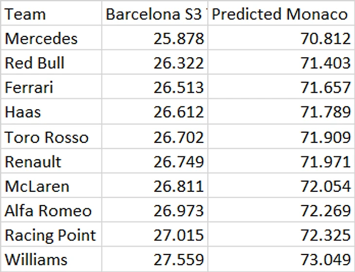На основании этих данных блогер разработал математическую модель, по которой рассчитал ожидаемое время поула на Гран-при Монако на основе результатов в третьем секторе каталонского трека.