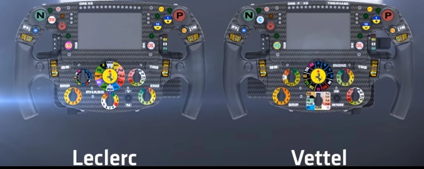 Официальный сайт «Формулы-1» совместно с техническим экспертом Джорджо Пиолой показал различия в рулях гонщиков «Феррари» Себастьяна Феттеля и Шарля Леклера.