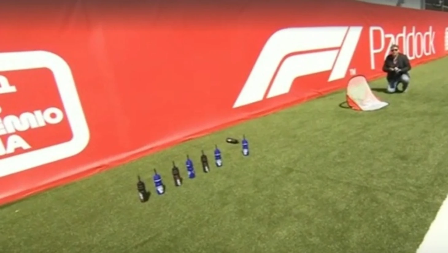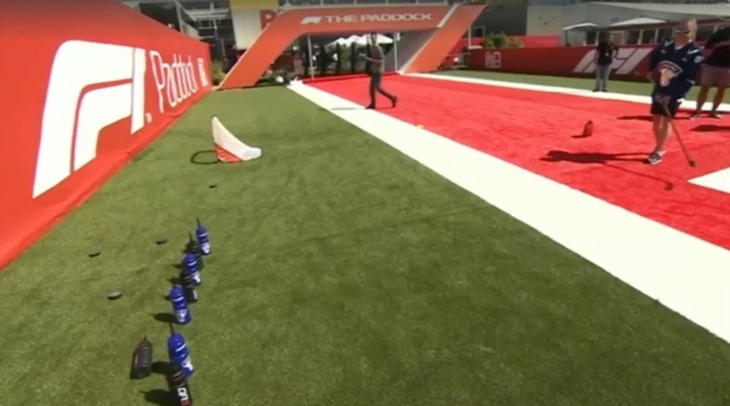Цель соревнования заключалась в сбивании бутылок шайбой — Строллу надо было сбивать синие бутылки, а Боттасу — черные.