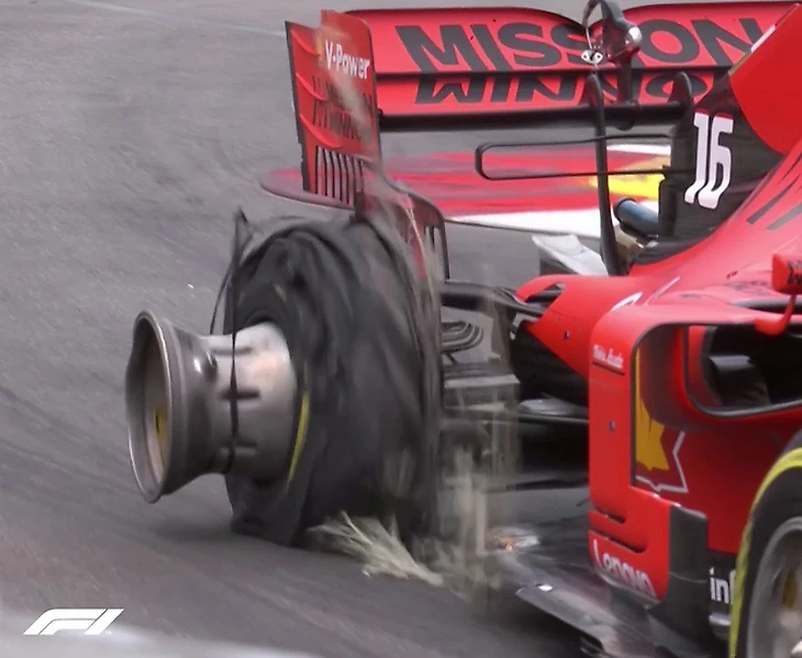 Шина разбортовалась и сильно повредила днище — Шарль хоть и вернулся в боксы за новым комплектом покрышек, но потерял огромное количество прижимной силы.