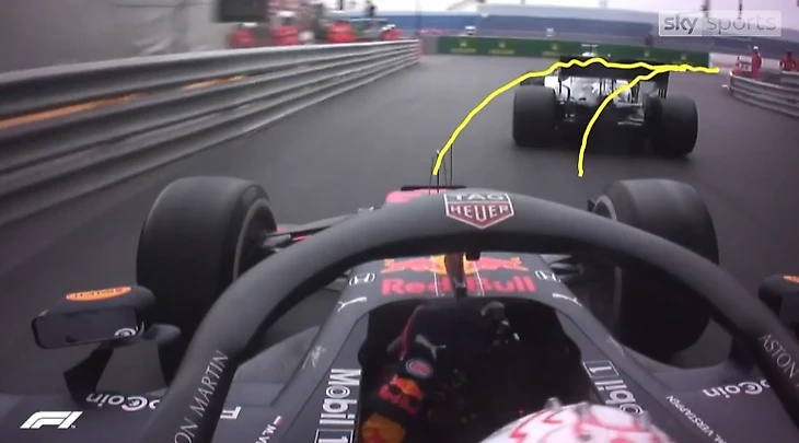 Перед «Портье» Льюис решил уйти в оборону. Посмотрите на угол машины и на позицию Ферстаппена со сравнению с Хэмилтоном.