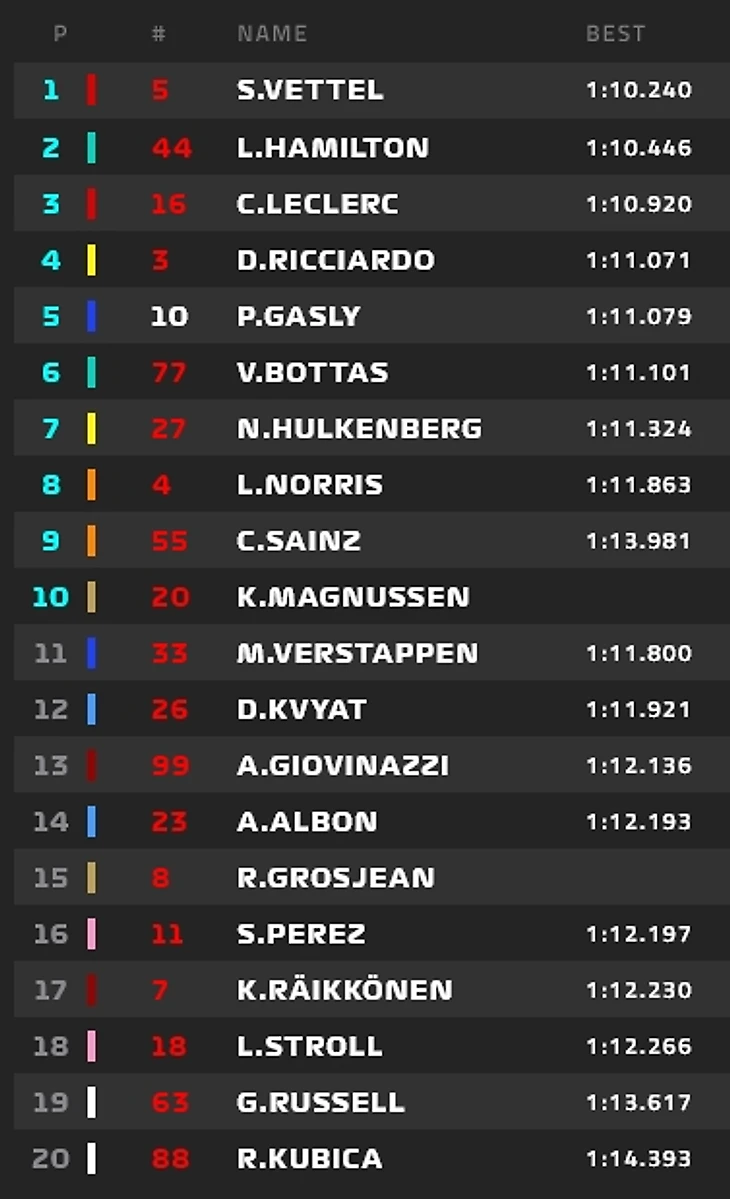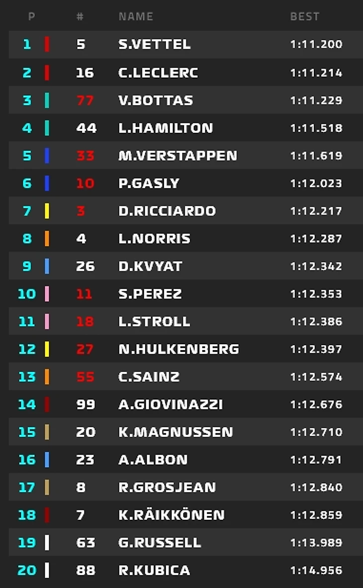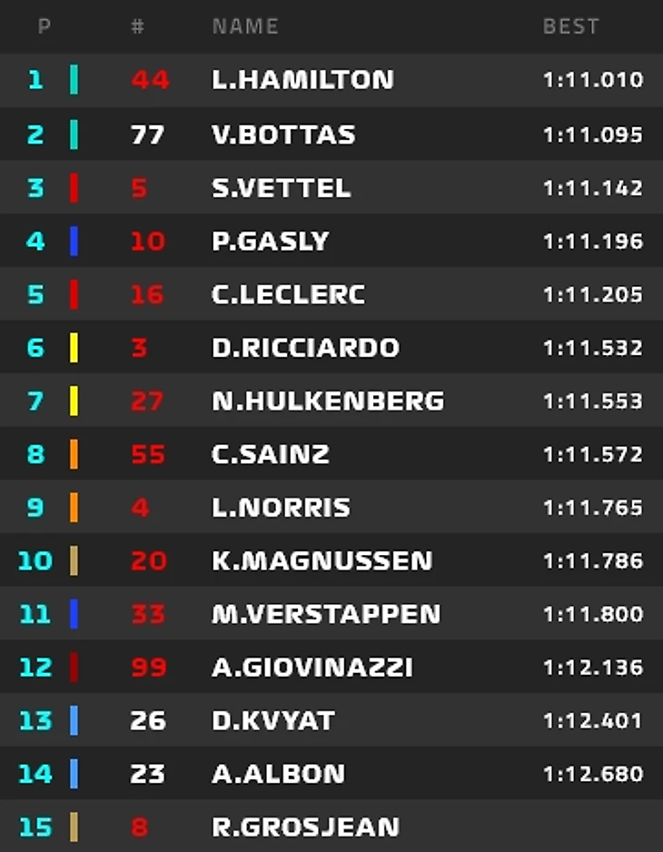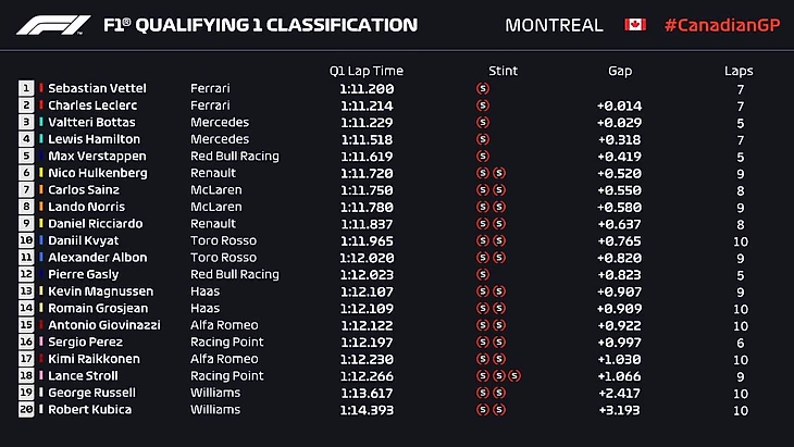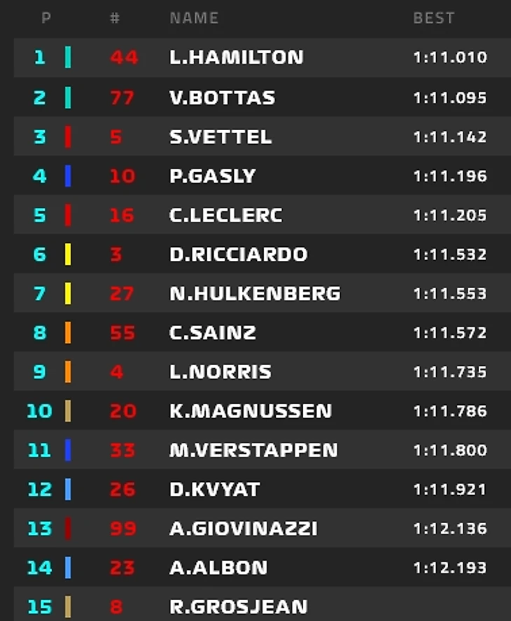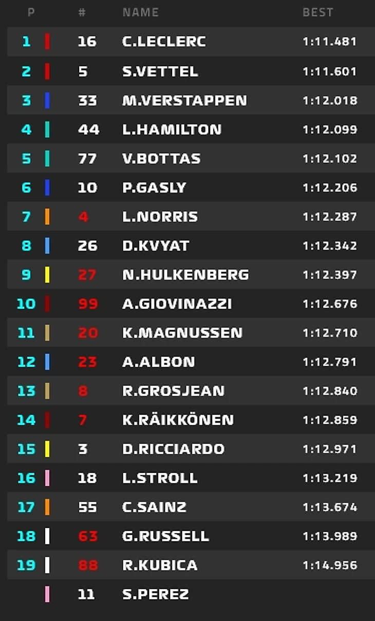 В итоге не прошли во второй сегмент: Перес, Райкконен, Стролл, Расселл и Кубица.