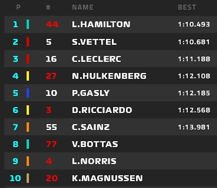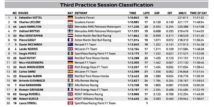 21:12 Боттас – 1.11,229 – это лучшее время, но его тут же сдвигает на второе место Леклер – 1.11,214. И быстрее обоих – Феттель – 1.11,200!