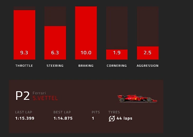 В соответствии с ними лучше всех пилотировал гонщик «Феррари» Себастьян Феттель — его оценка в 6,0 сложилась из 9,3 за работу с педалью газа, 6,3 за работу рулем, 10 за работу на торможениях, 1,9 за прохождение поворотов и 2,5 за «агрессивность». Себ стартовал с поула и финишировал первым, но в итоговых протоколах оказался вторым из-за штрафа за небезопасное возвращение на трассу.