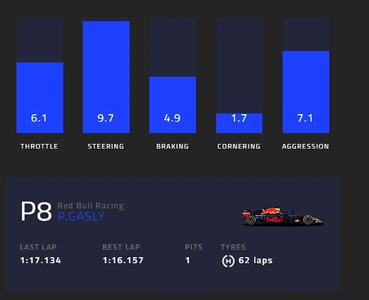 Наравне с Хэмилтоном оценили и пилота «Ред Булл» Пьера Гасли — но он отстал на круг и потому ниже. Его оценка в 5,9 сложилась из 6,1 за работу с педалью газа, 9,7 за работу рулем, 4,9 за работу на торможениях, 1,7 за прохождение поворотов и 7,1 за «агрессивность». Пьер финишировал лишь восьмым.