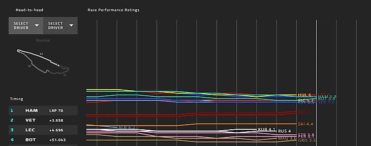 На официальном сайте «Формулы-1» в разделе лайвтайминга на странице «выступлений» появились оценки пилотам за Гран-при Канады, основанные на данных телеметрии.