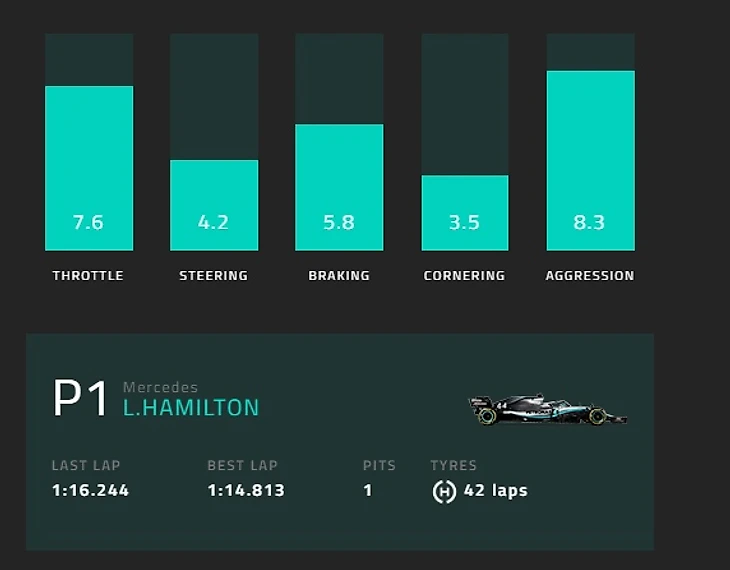 Второй результат показал Льюис Хэмилтон из «Мерседеса». Его оценка в 5,9 сложилась из 7,6 за работу с педалью газа, 4,2 за работу рулем, 5,8 за работу на торможениях, 3,5 за прохождение поворотов и 8,3 за «агрессивность». Англичанин стартовал и финишировал вторым, но выиграл гонку судейским решением.