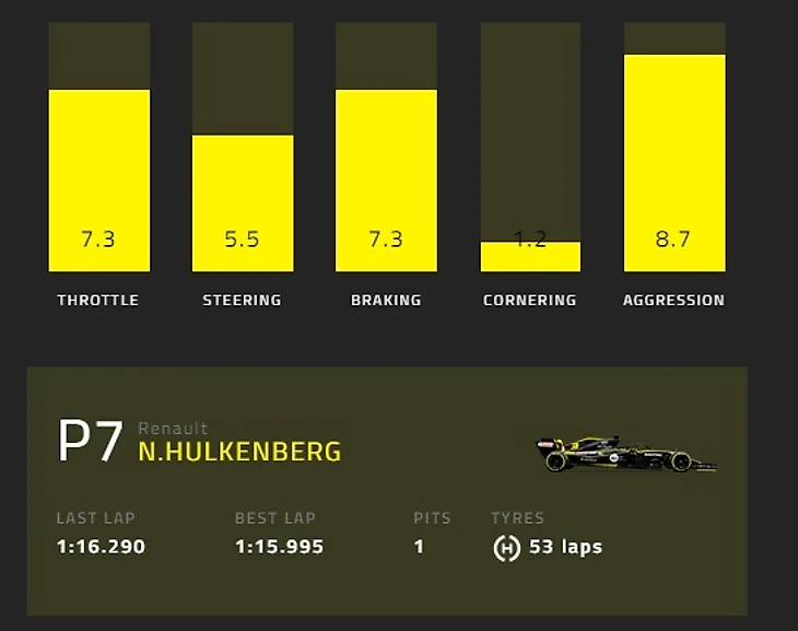 Одинаковый с Себом балл получил немецкий пилот «Рено» Нико Хюлькенберг (третье место в рейтинге на Гран-при Монако и лидер с Гран-при Испании). Его оценка в 6,0 сложилась из 7,3 за работу с педалью газа, 5,5 за работу рулем, 7,3 за работу на торможениях, 1,2 за прохождение поворотов и 8,7 за «агрессивность». Немец обогнал на старте Валттери Боттаса и благодаря бережному обращению с шинами опередил из-за стратегии пилота «Ред Булл» Пьера Гасли, но затем столкнулся с неполадками в коробке передач. В конце гонки он даже с двумя барахлившими передачами был быстрее напарника Даниэля Риккардо, но «Рено» запретила Халку атаковать, и в итоге Нико финишировал седьмым.
