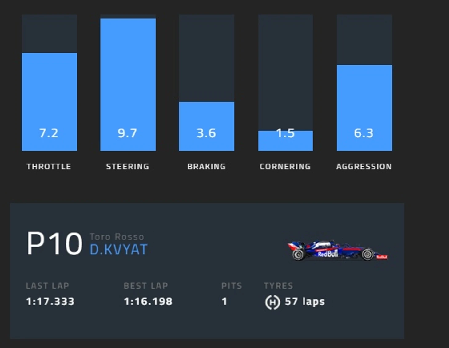 Российский гонщик «Торо Россо» Даниил Квят оценен чуть хуже — 5,6 балла — но он снова поразил всех работой рулем. Она заработала почти максимальную оценку в 9,7 (только Гасли из всего пелотона смог приблизиться). В 7,2 оценили его работу с педалью газа, в 3,6 — работу на торможениях, в 1,5 прохождение поворотов и в 6,3 — агрессивность.