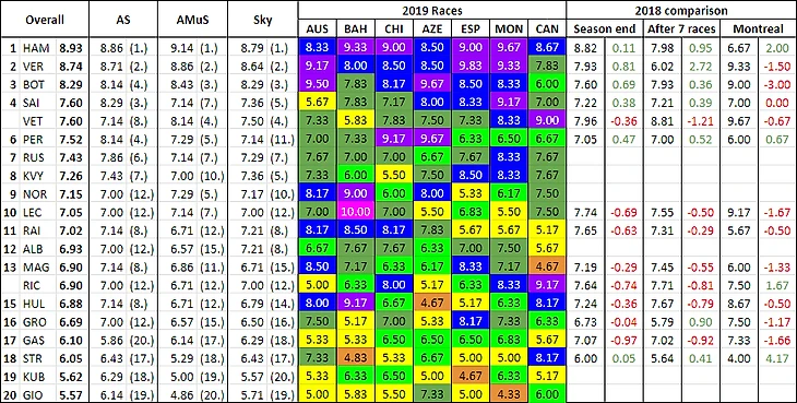 Первая графа — средняя оценка трех изданий за сезон, вторая — баллы от Autosport за сезон, третья — от Auto Motor und Sport за сезон, четвертая — от Sky Sports за сезон. Графа CAN – среднее арифметическое от изданий по результатам Гран-при Канады.