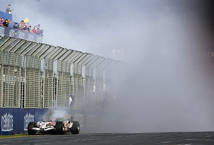 А это везунчик Дженсон Баттон с Гран-при Австралии 2006 года — его «Хонда» сдалась за два поворота до финиша, и англичанин остановился буквально перед финишной чертой по совету механиков — тогда новую силовую установку можно было поставить без штрафов.